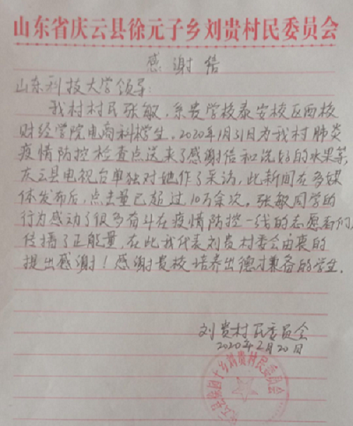 新冠肺炎疫情发生后,家住庆云县刘贵村张敏同学时刻关注着疫情动态,心系武汉群众,一直想为家乡做点什么,了解到村里的志愿值班人员不分昼夜轮流值班站岗,全力保障家乡人民生命安全而默默付出时,于是张敏将提前洗好的水果送到刘贵村村口的志愿值班人员手中,同时写了一封感谢信,致敬在疫情防控中坚守群众生命安全的值班人员。张敏的举动使志愿值班人员倍感温暖、深受鼓舞,大家表示:有党的坚强领导,有群众的鼎力支持和配合,一定能打赢这场防疫战。