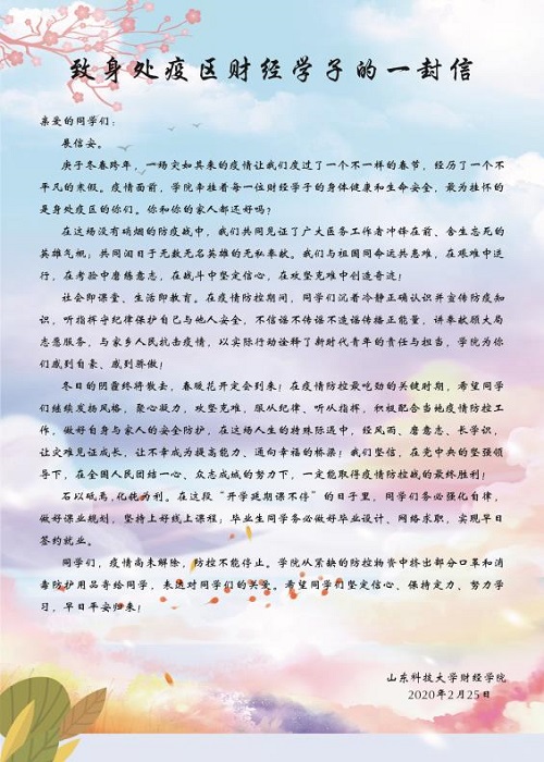 “一场突如其来的疫情让我们度过了一个不一样的春节,经历了一个不一样的寒假,疫情面前,公司牵挂着每一位利来国际学子的身体健康和生命安全,最为牵挂的是身处疫区的你们,你和你的家人都还好吗?”