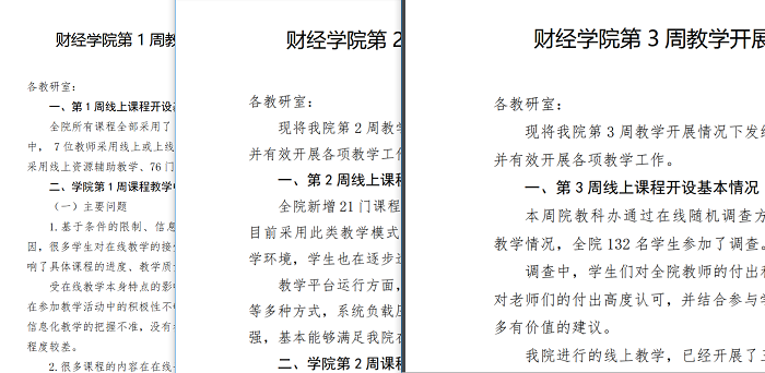公司每一周均对教学开展情况进行总结并面向全院下发总结材料,其中对在线课程开设情况进行说明、提出一周内教学中存在的主要问题及建议,有效的指导了全院教师的教学工作。