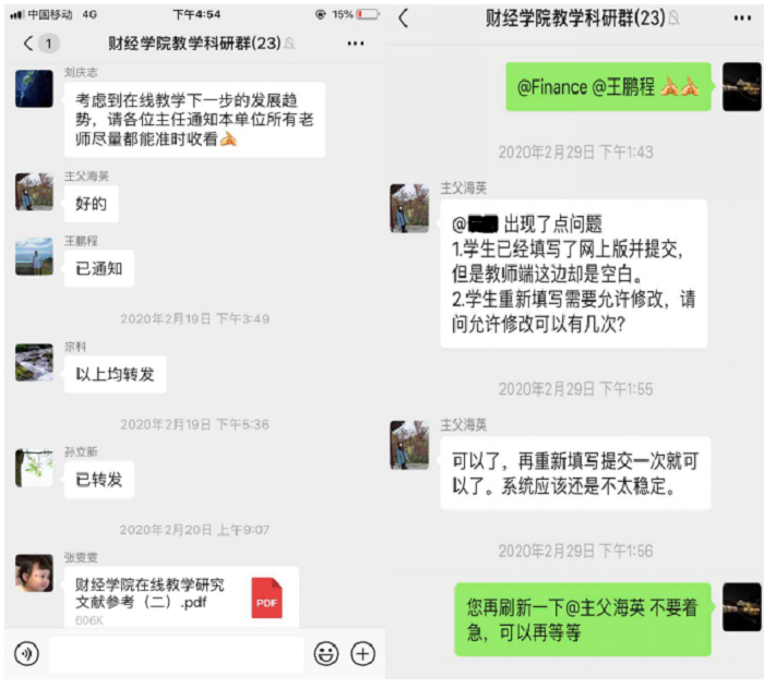 在线教学过程中难免出现一些问题,院教科办和各专业负责人积极利用微信群、在线视频等方式进行沟通,第一时间对问题进行分析并提出具体的对策。