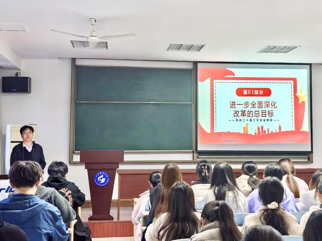 陈炳志首先从党的二十届三中全会最重要的成果--《中共中央关于进一步全面深化改革、推进中国式现代化的决定》入手,针对提出背景、主要内容和重大意义为同学们进行了全面深入的阐释,并从新时代全面深化改革的重大成就、进一步全面深化改革的总目标、重大原则、《决定》重要改革举措等四个方面对党的二十届三中全会精神进行全面、深入、系统的宣讲解读。